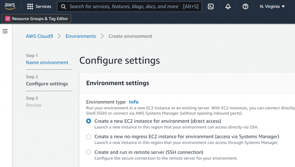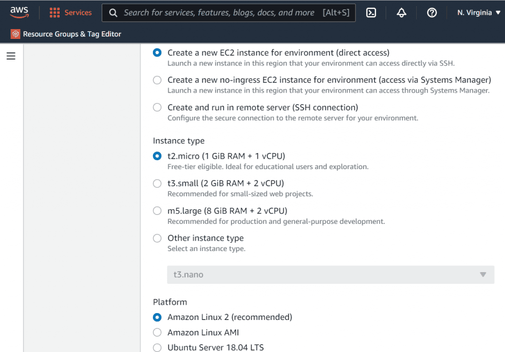 It will redirect to configuration settings. Select “new EC2 instance” as the Environment type.