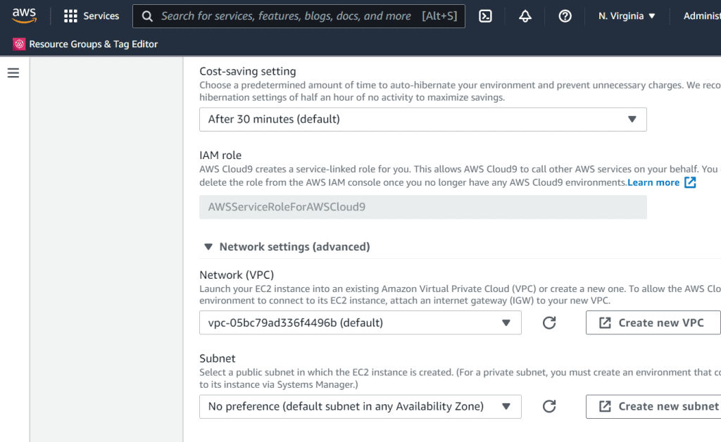 Keep default VPC and Subset configuration. This is where you can create and configure your own new VPC and subnet if required.