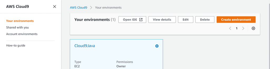 15. AWS Cloud9 service home screen looks like the below once the environment is created. You can access created Cloud9 IDE directly from here by clicking Open IDE.