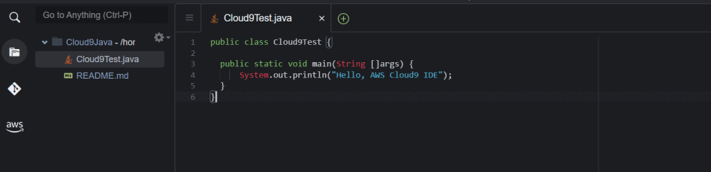 In the AWS Cloud9 IDE, on the menu bar, select File and New File. create a file with the following code, and save the file with the name Cloud9Test.java.