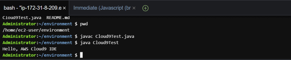 5. In the Cloud9 terminal, execute the below commands to compile and run Cloud9Test.java.