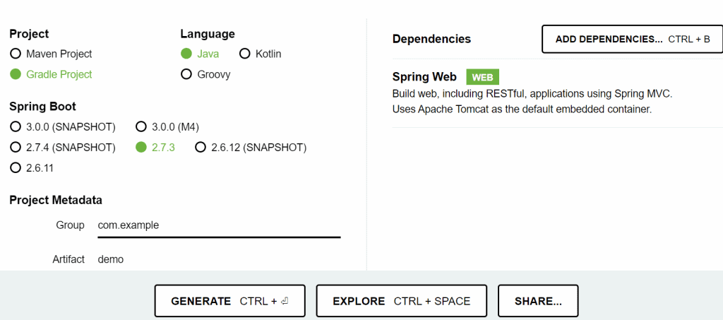 Step 4 – On Spring Initializer, add “Spring Web” as a dependency.