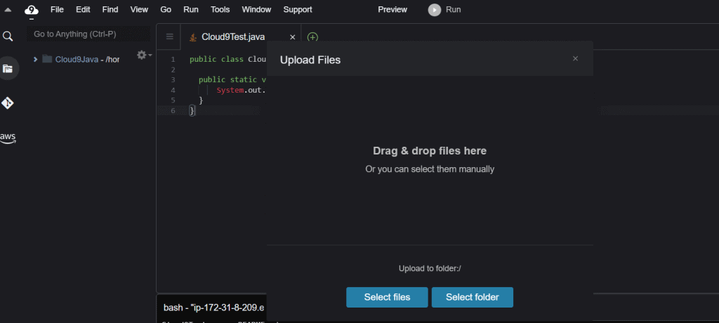 Step 1– Go to the AWS Cloud9 IDE instance we configured above in the article and select File menu and then Upload Local Files