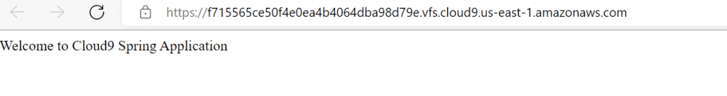 We should see the output of our spring boot application’s controller. Note that the URL is powered by the processes running within our Cloud9 environment. So this is accessible only until our terminal process is running in the Cloud9 IDE.