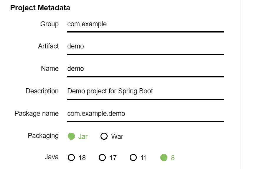 Step 3 – On Spring Initializer, configure the project meta data. We will leave all defaults as is, except that we’ll select Java 8.