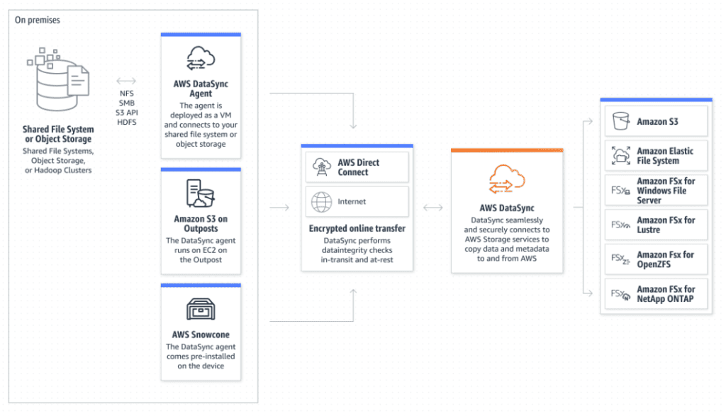 - AWS Storage Services: DataSync integrates seamlessly with Amazon S3, Amazon EFS, and Amazon FSx, allowing for versatile data transfer scenarios.