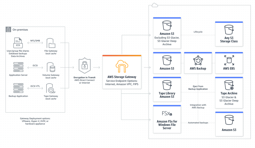 - Amazon S3: File Gateway provides a seamless interface to store and retrieve Amazon S3 objects.